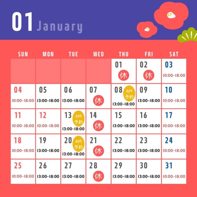 1/12(月)は祝日のため、10:00~18:00で営業しております。